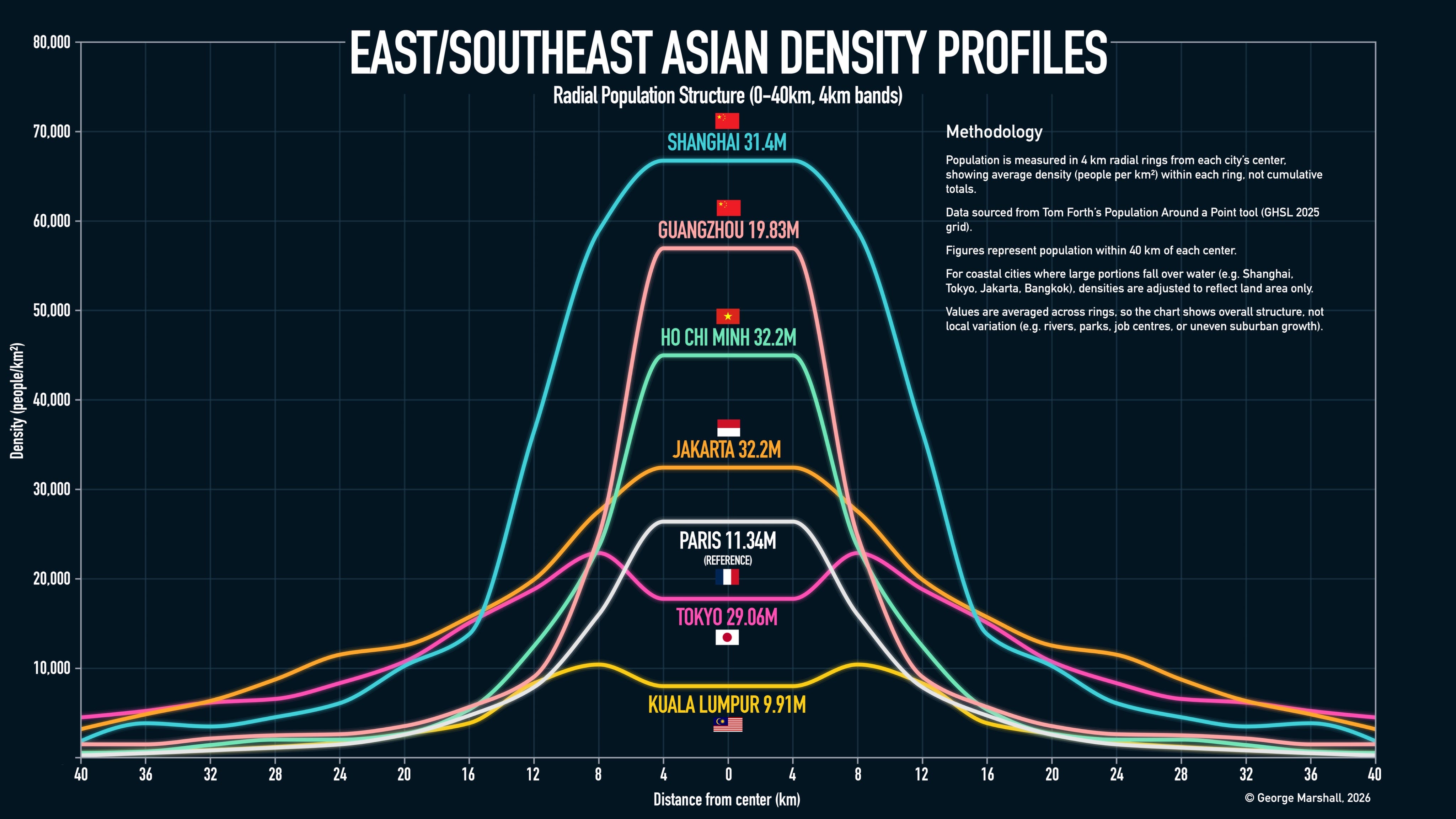 The part where density drops at the center for Tokyo isn't an artifact, but I get the impression that Tokyo's public transit is good enough that the center of town actually has less residential than the area just outside the center of town.
