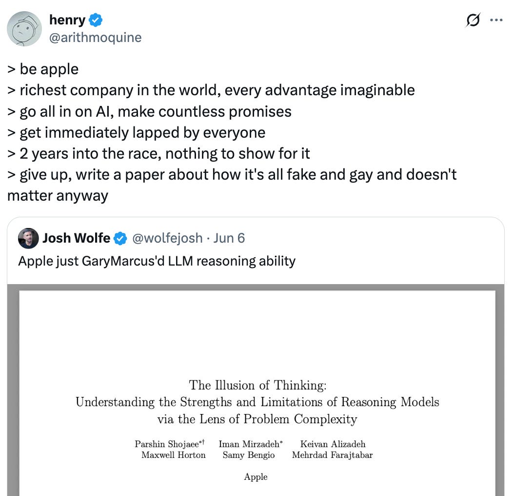 Here's an explanation (cached) of the key problems with Apples new academic paper purporting to show serious limitations of llm reasoning models. I could have guessed without even opening it that a one issue is that they don't let it use python. Here's another explanation (cached). Some folks have interpreted this as folks reading this paper and misinterpreting it, but the title is pretty direct, "The Illusion of Thinking" is a pretty bold title!