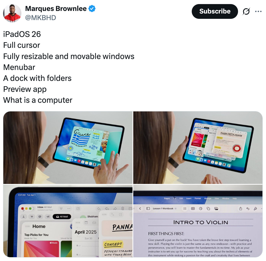 iPad finally has a full windowing system. It still doesn't run MacOS or Mac apps, but it sure looks a lot like a mac. Dan Moren has a rundown of highlights and lowlights for each of Apple's platforms from WWDC via gruber.