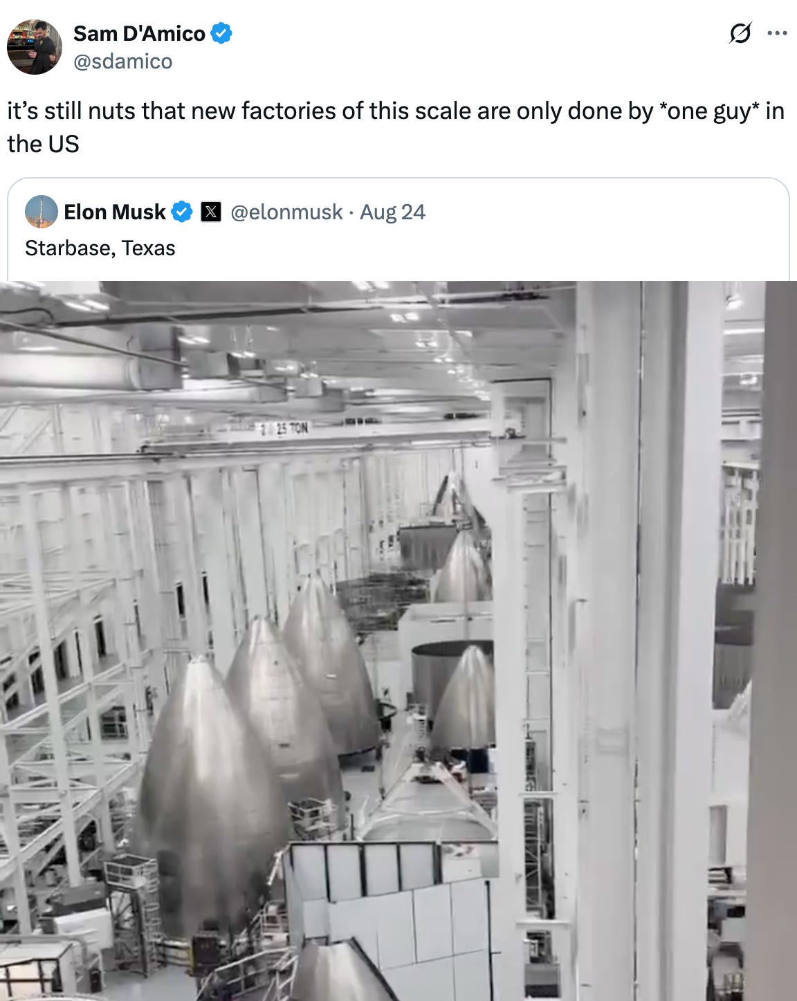 In case it’s not clear, that’s an assembly line for SpaceX Starship, a Saturn V class heavy-lift rocket, except each one is reusable. We really should be finding a way to incentivize creation of new large-scale factories in the US. In recent years it seems like it's just Musk and Hyundai (cached). but the current administration’s tariffs in input materials are going to hobble new factories. Even Mike Pence knows that the structure of Trump’s tariffs hurts American manufacturing instead of helping, and he's out there posting about it (cached).