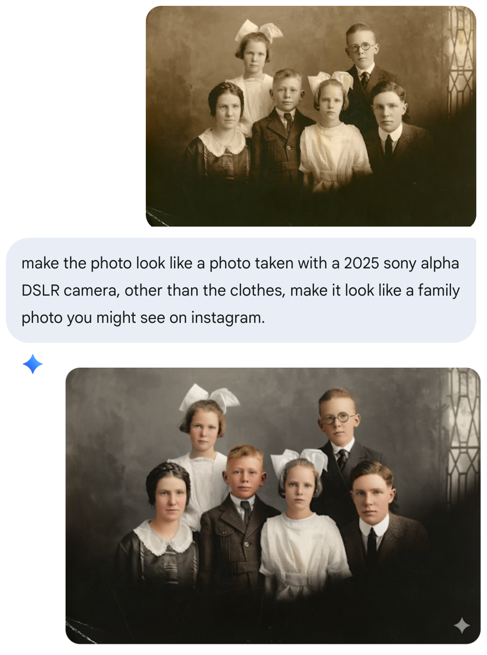 I tend to get the best results when I don’t ask for colorization. There’s too many examples out there of that not looking very good. While it can’t intuit hair color from a B/W photo, it’s simple enough to fix it if you know the correct color.