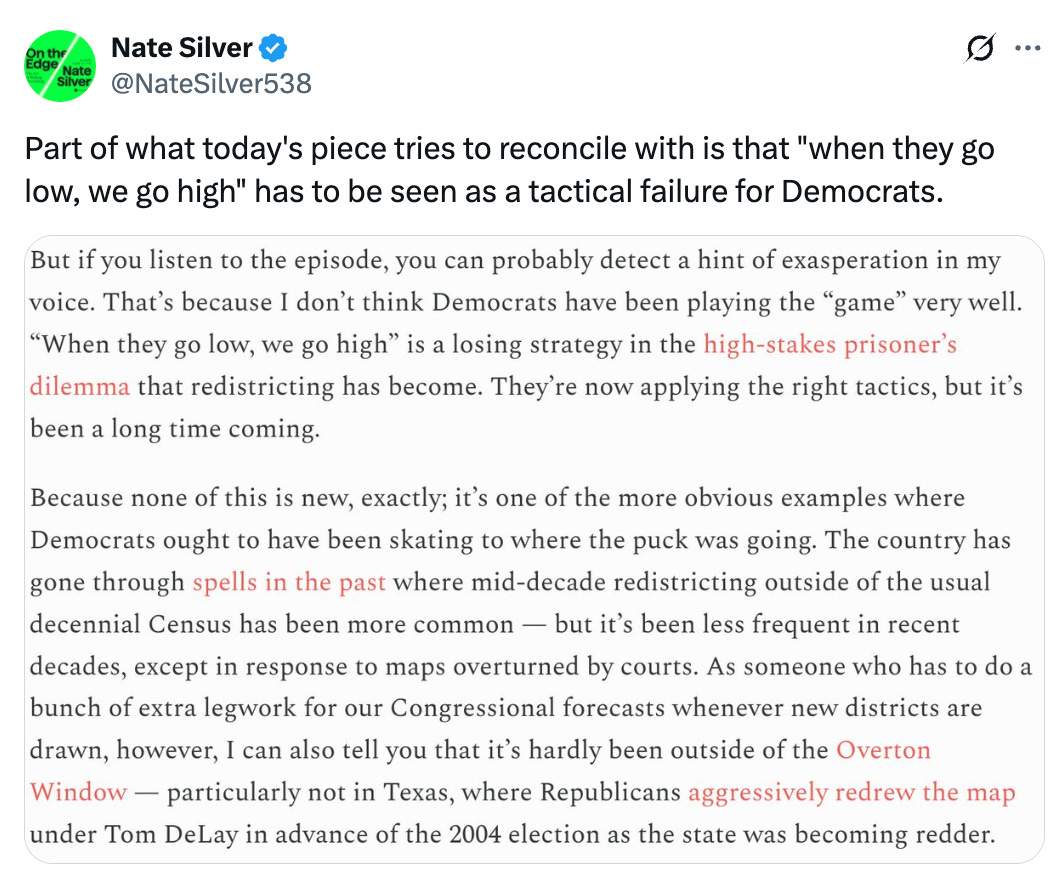 I really appreciate that Nate Silver handled the math of whether an all-out war in Gerrymandering between red and blue states would advantage Republicans or Democrats. Seems likely to be either a wash or a slight Dem edge.