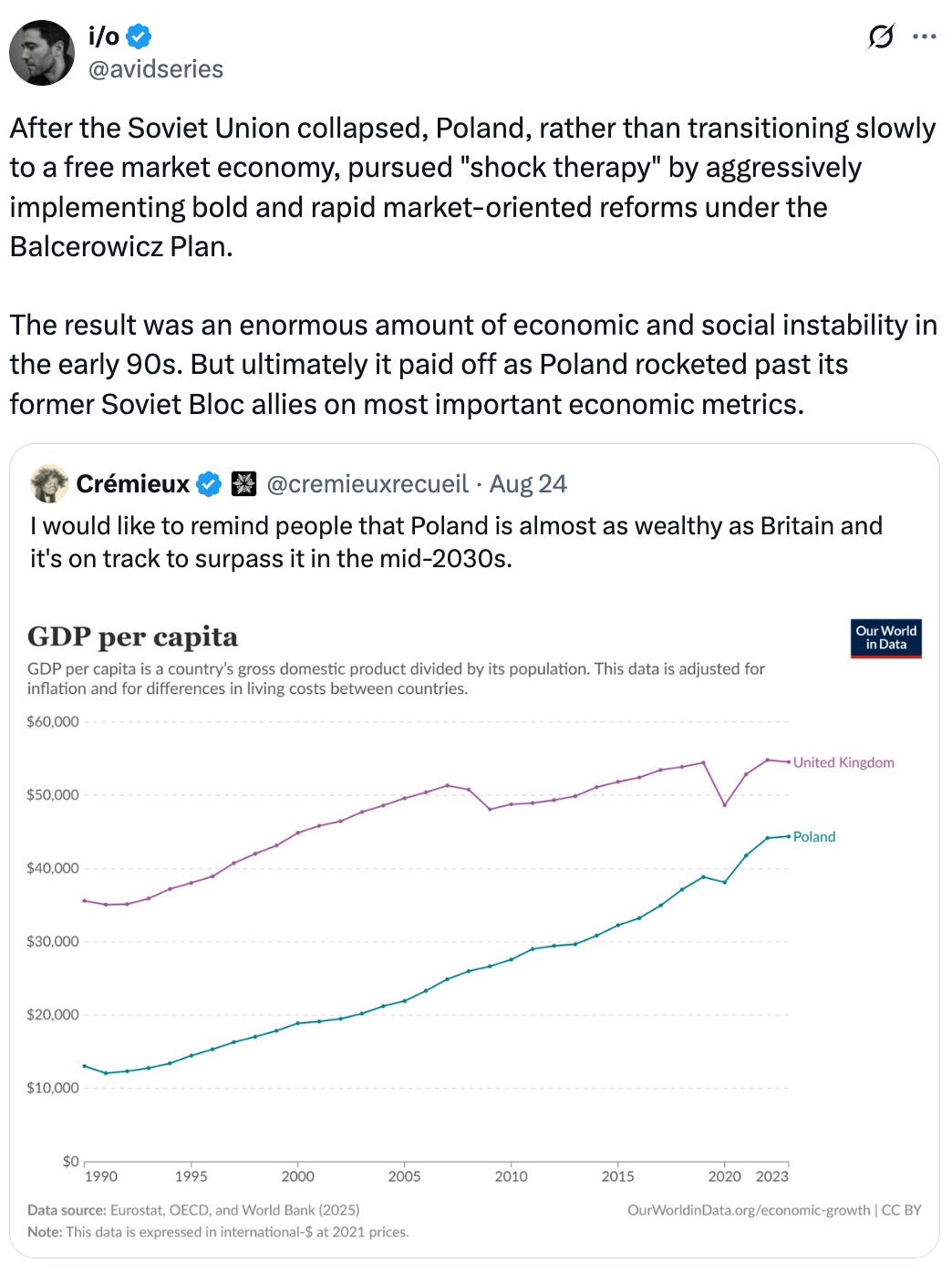 It’s not like every Eastern European country had this kind of growth after the Cold War. Some didn’t do these kinds of reforms, but mostly the others were just extremely corrupt. There’s really no substitute for low levels of public corruption the core thing (cached) Russia was lacking. On the other hand, the UK's lack of progress is impressive in a sort of grotesque way (cached), how do they stay as prosperous as they have with such a horrible degrowth electrical policy. Part of the answer is that this is measuring income, not wealth (cached), the UK is still very wealthy.