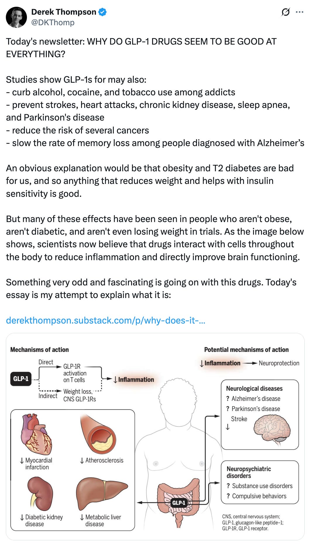 I have not yet read this article, but I'm happy he wrote it, the title of the article asks a question I want to know the answer to: "If GLP-1 Drugs Are Good For Everything, Should We All Be on Them?"