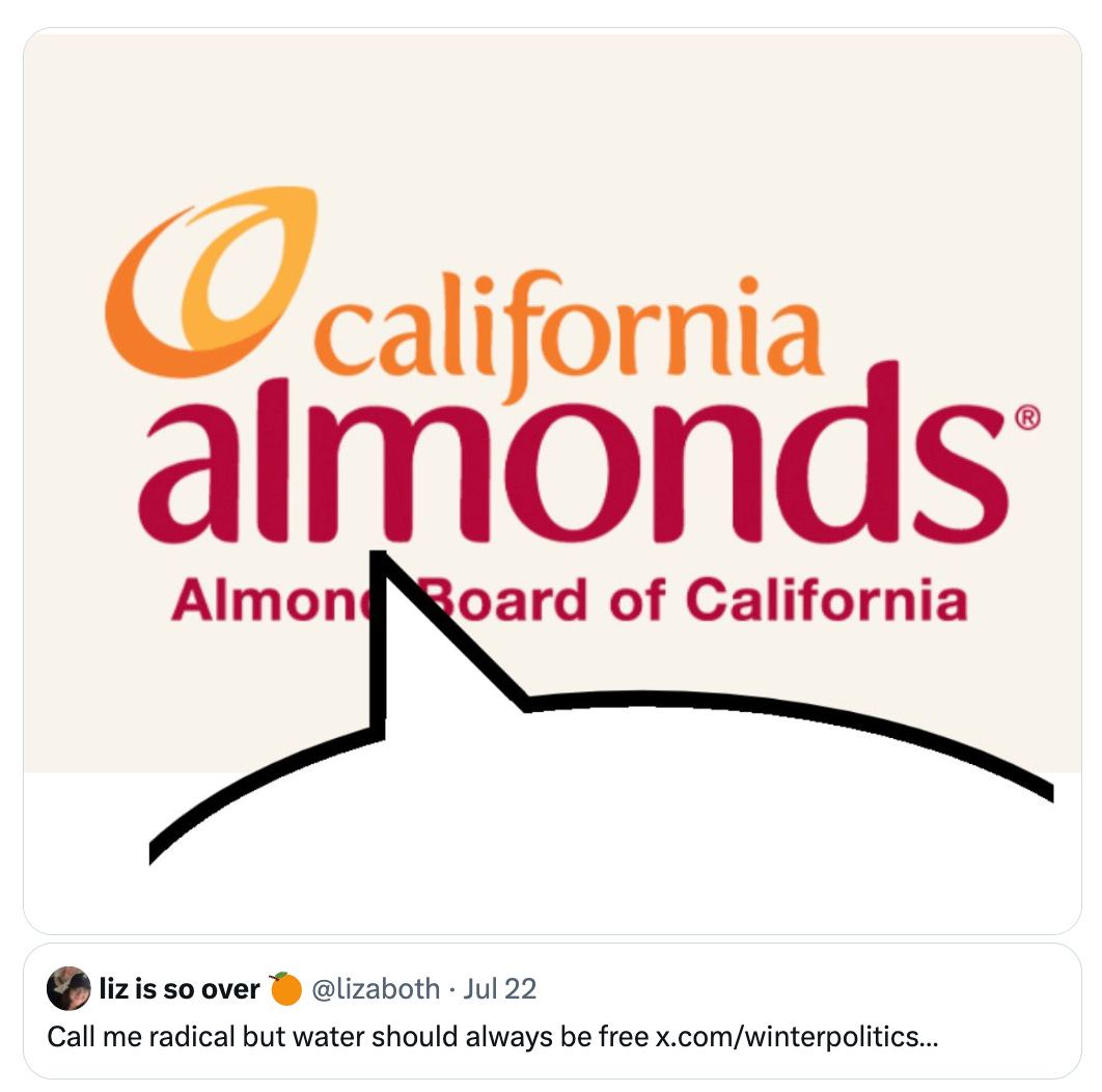 This is a new meme format, not necessarily the best use of it I've ever seen, but I think the speech bubble wrapping around the retweeted post is a great trick. Obviously you don’t always have to make it the California Almond Board.